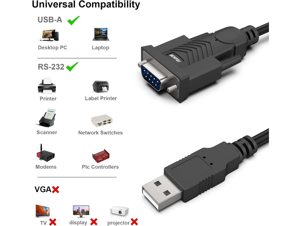 Adaptér umožňuje připojení zařízení, která používají standardní RS-232 sériový port (9-pin), jako jsou tiskárny, měřicí přístroje, průmyslové stroje nebo starší zařízení. Ideální pro práci v laboratorním, průmyslovém nebo kancelářském prostředí.