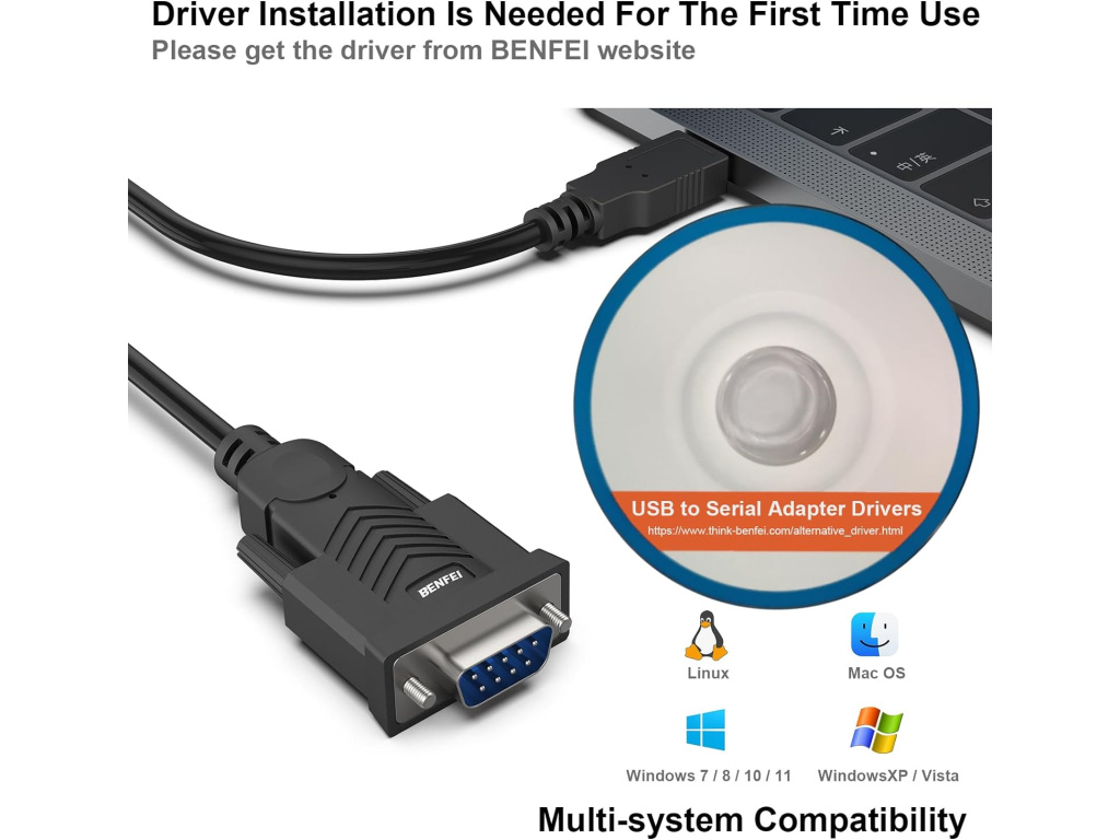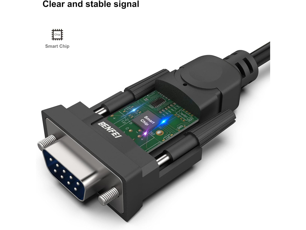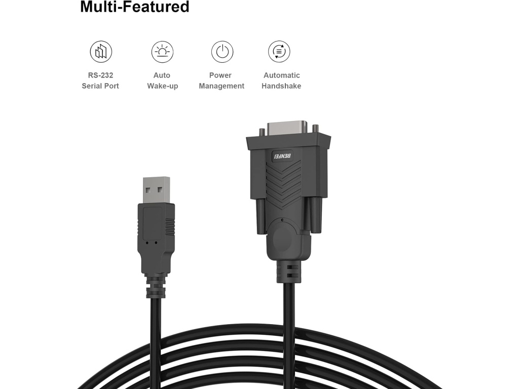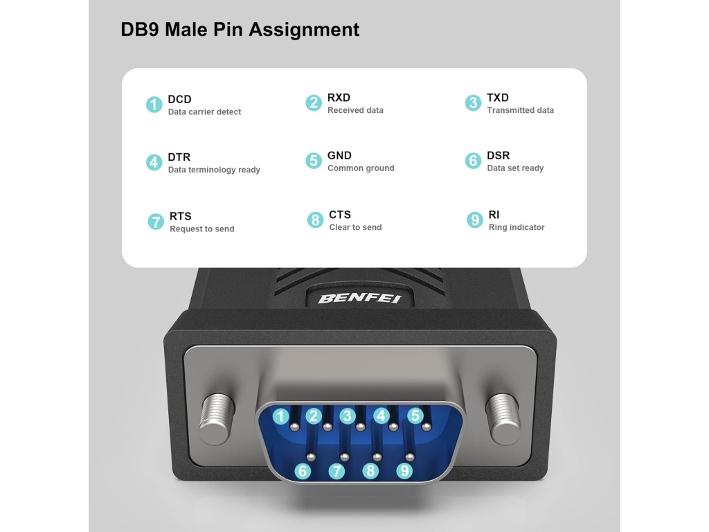 BENFEI USB na sériový RS-232 adaptér (samec, 9-pin, 1,8 m) je praktickým a spolehlivým řešením pro připojení zařízení se sériovým portem k moderním počítačům. Díky kvalitnímu chipsetu, široké kompatibilitě a robustní konstrukci je ideální pro profesionální i běžné použití.