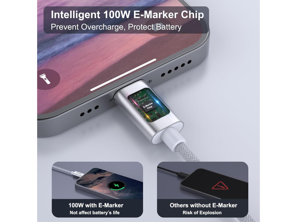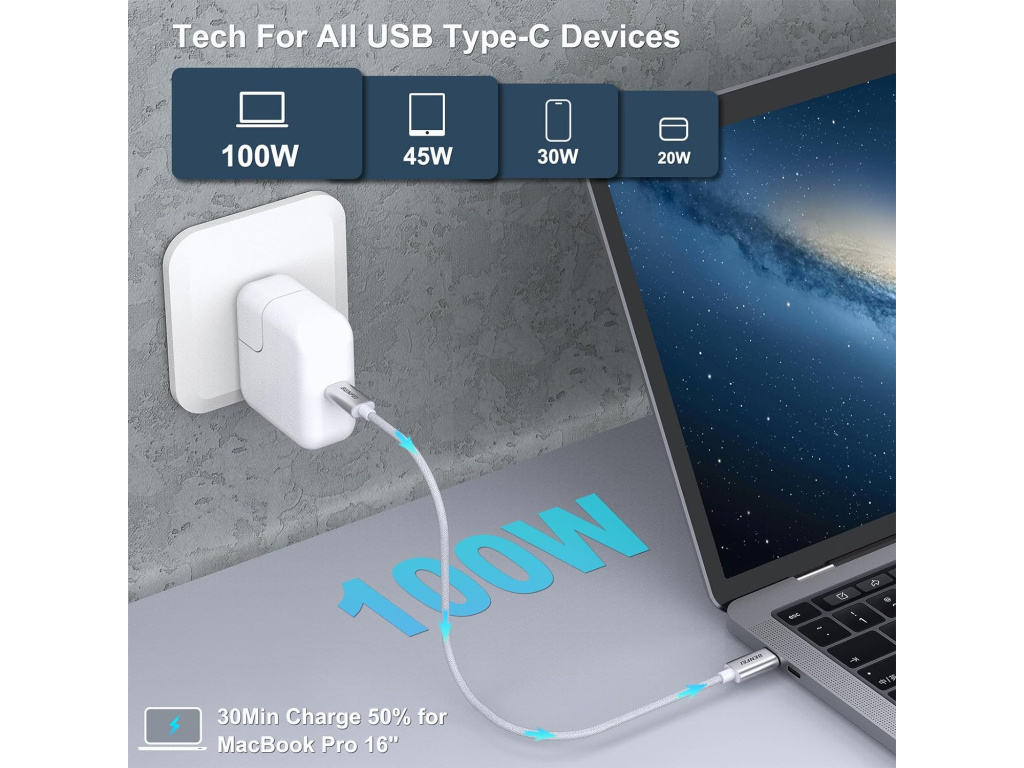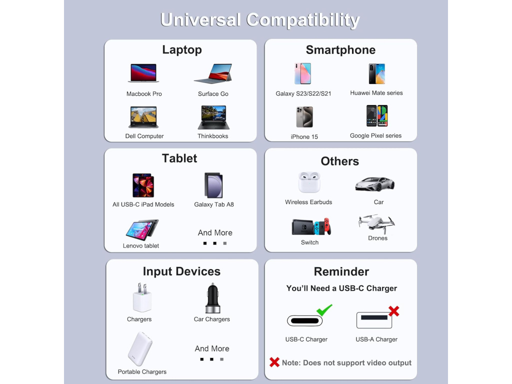 Kabel je kompatibilní s širokou škálou zařízení, která podporují USB-C připojení, včetně MacBook Pro, iPad Pro, iPhone 15, Samsung Galaxy S23 a dalších. Je vhodný pro nabíječky s vysokým výkonem i standardní USB-C adaptéry.