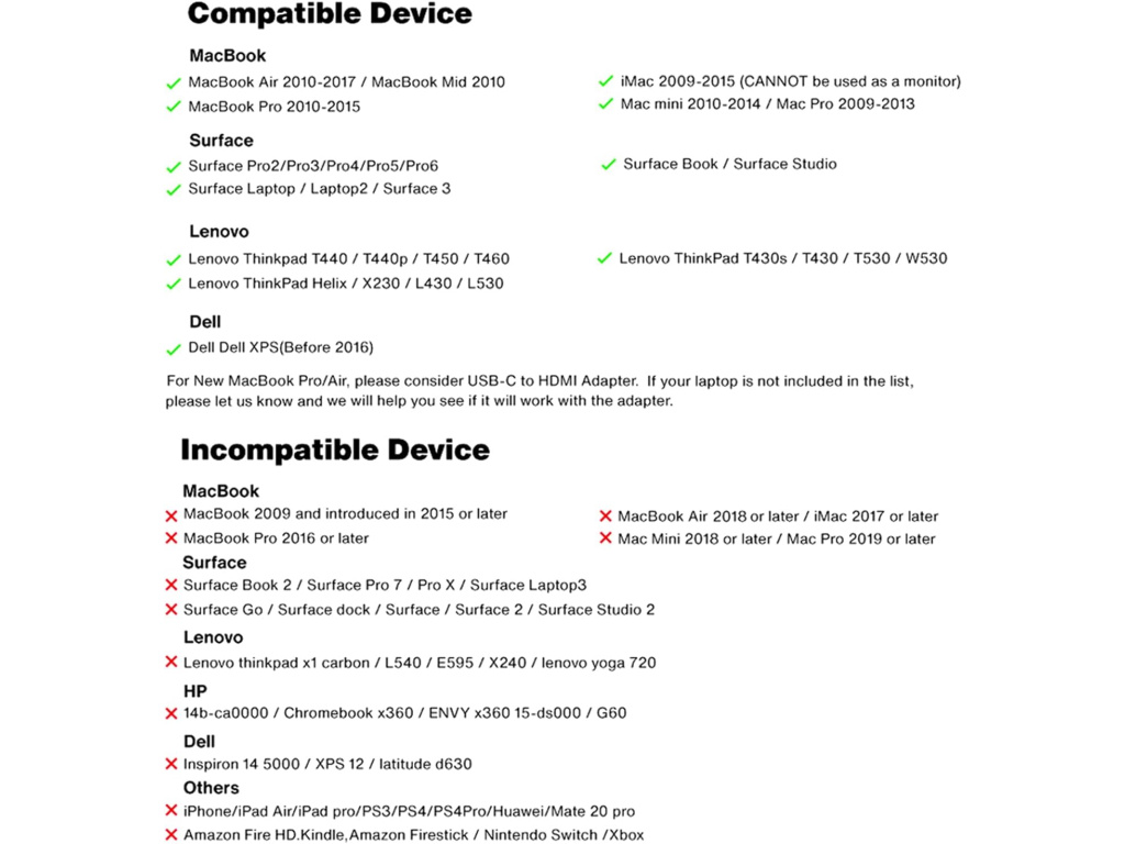 Adaptér je kompatibilní s širokou škálou zařízení s Mini DisplayPortem a Thunderbolt 2, jako jsou MacBook Air, MacBook Pro, Microsoft Surface Pro, iMac a další. HDMI výstup je kompatibilní s většinou moderních monitorů, televizorů a projektorů.
