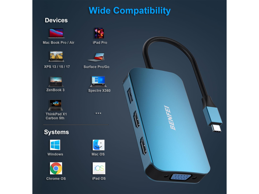 Benfei je značkou pro ty, kteří kladou důraz na funkčnost a praktičnost. Ať už potřebujete efektivní řešení pro práci, nebo nástroje pro rozšíření možností vašeho zařízení, Benfei vám přináší spolehlivé a snadno použitelné produkty.