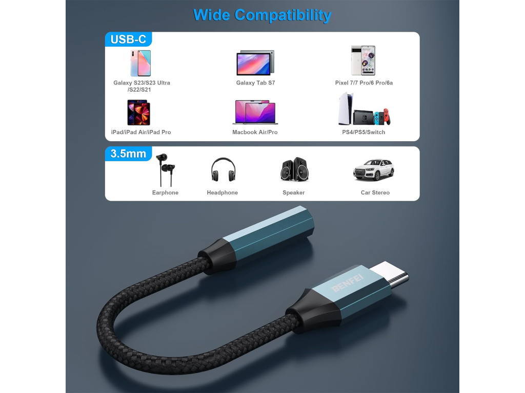BENFEI USB-C na Headphone Jack kabel (1,8 m, modrý) je spolehlivé a praktické řešení pro připojení sluchátek nebo zvukových zařízení k moderním zařízením, která postrádají tradiční 3,5mm audio jack. Díky moderní technologii a odolnému designu je ideální pro každodenní použití.