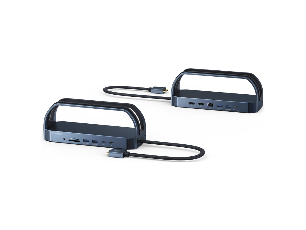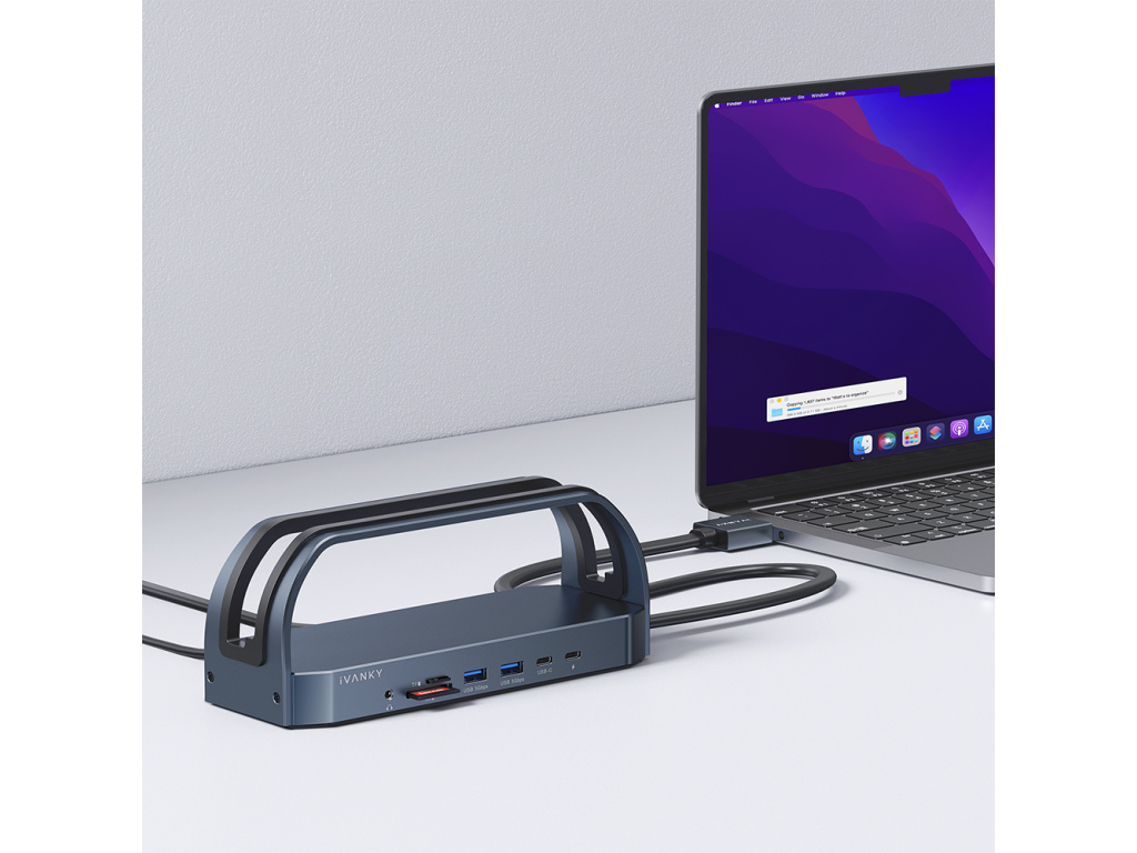Dokovací stanice umožňuje vytvořit elegantní, čistý a dokonale organizovaný pracovní prostor. MacBook může být uzavřený ve stojanu, přičemž veškerý výkon směřuje do dvou 4K monitorů. Vše působí kompaktně, technicky čistě a připravené pro náročnou každodenní práci.