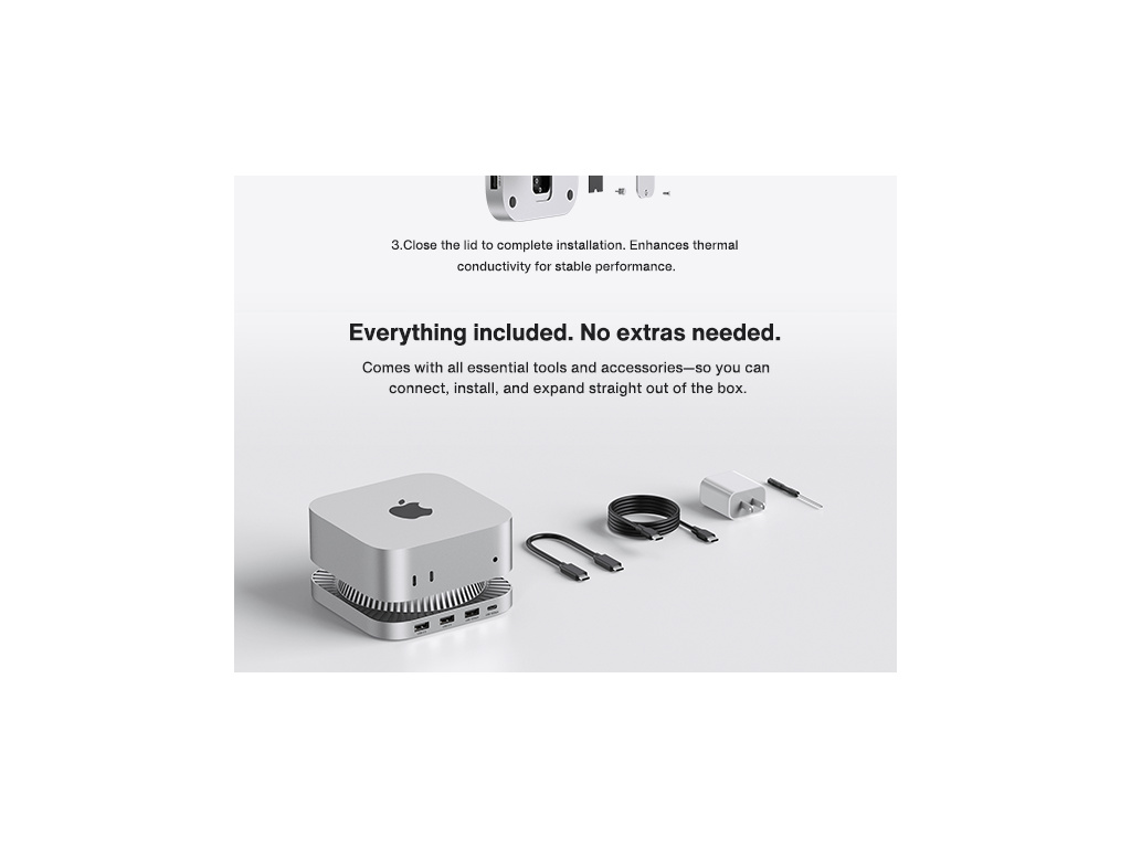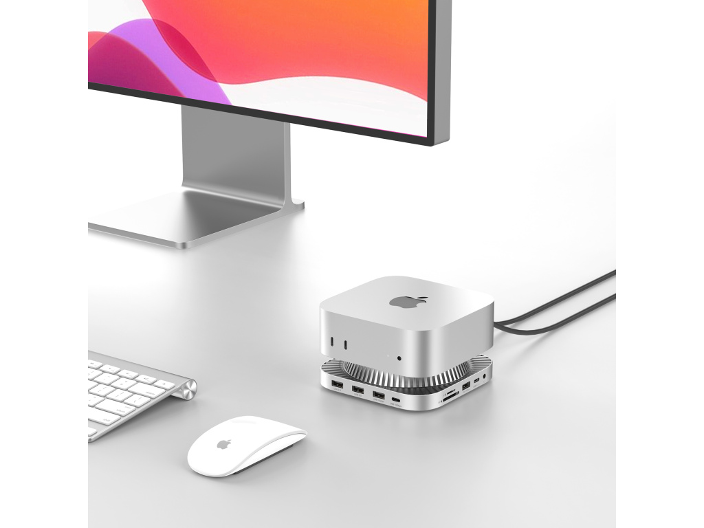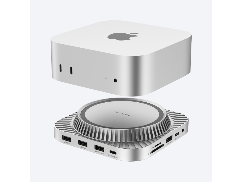 Konstrukce respektuje proporce Macu mini M4 a vytváří s ním precizně sladěný celek. Tělo doku z hliníkové slitiny odpovídá vzhledu i povrchové úpravě Macu, což dodává sestavě jednotný, technicky čistý vzhled. Funkční prvky jsou umístěny s maximálním ohledem na ergonomii, což usnadňuje každodenní použití a udržuje pracovní stůl dokonale organizovaný.