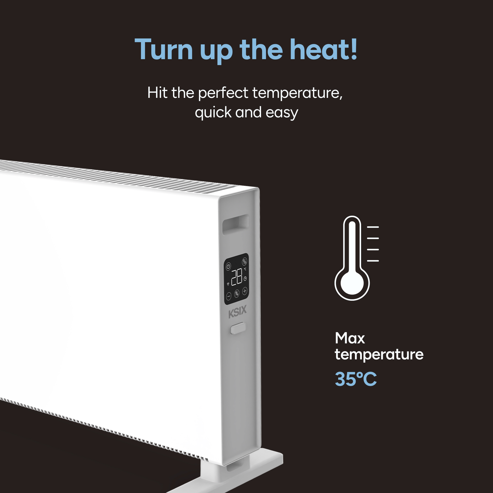 Výkonné a elegantní chytré elektrické topení KSIX Blaze 2000 W s LED dotykovým displejem, ovládáním přes aplikaci Tuya Smart a dálkovým ovladačem. Rychle vyhřeje místnost, přesně drží nastavenou teplotu a díky chytrým funkcím šetří čas i energii. Je navržené pro každodenní pohodlí a spolehlivý provoz v moderní domácnosti.