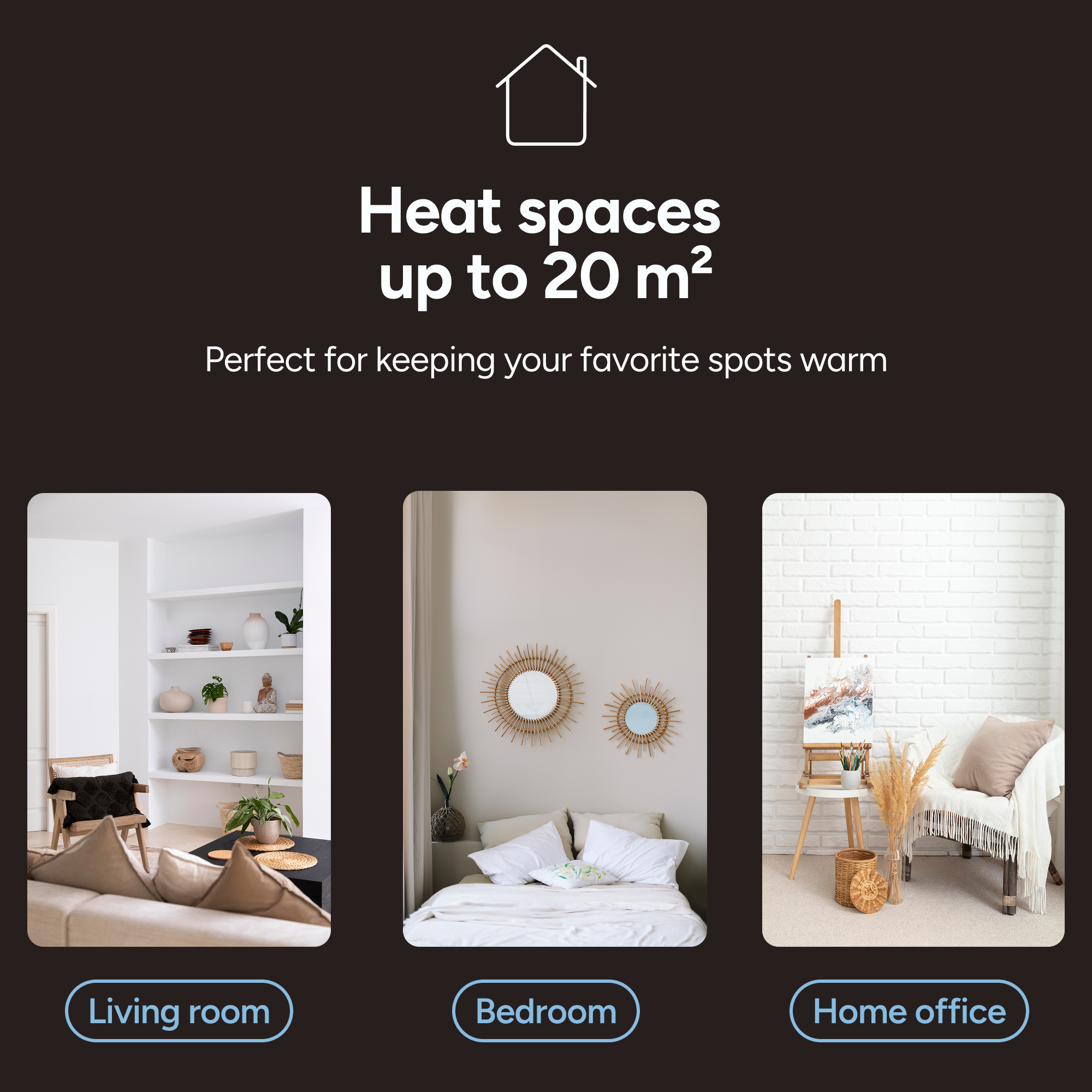 Topení je navrženo pro efektivní vytápění prostor o velikosti až 20 m², což z něj dělá skvělé řešení pro běžné místnosti v domácnosti. Dokáže rychle vyhřát obývací pokoj, ložnici i pracovnu a udržet v nich příjemnou teplotu. Díky rovnoměrnému rozptylu tepla nevznikají studená místa. Perfektní volba pro každodenní použití.
