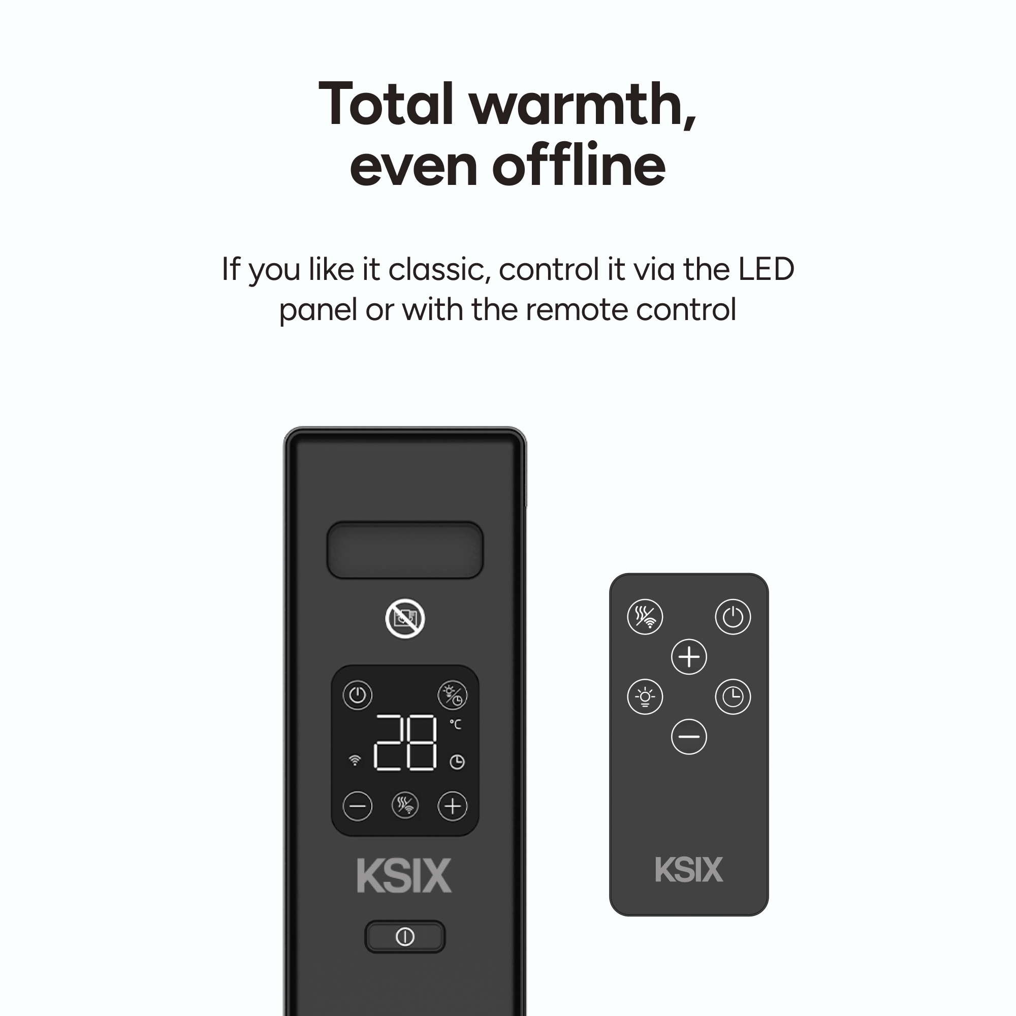 Topení je vybavené přehledným LED dotykovým panelem, který umožňuje okamžité nastavení teploty a funkcí. Součástí balení je také dálkový ovladač pro pohodlné ovládání z jakékoliv části místnosti. Podporováno je i hlasové ovládání přes Google Assistant a Amazon Alexa, takže stačí jen říct a teplo se přizpůsobí vašim požadavkům.