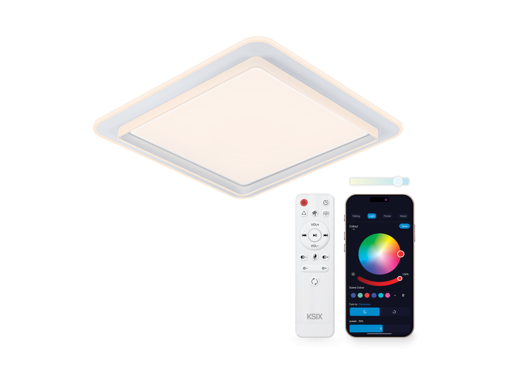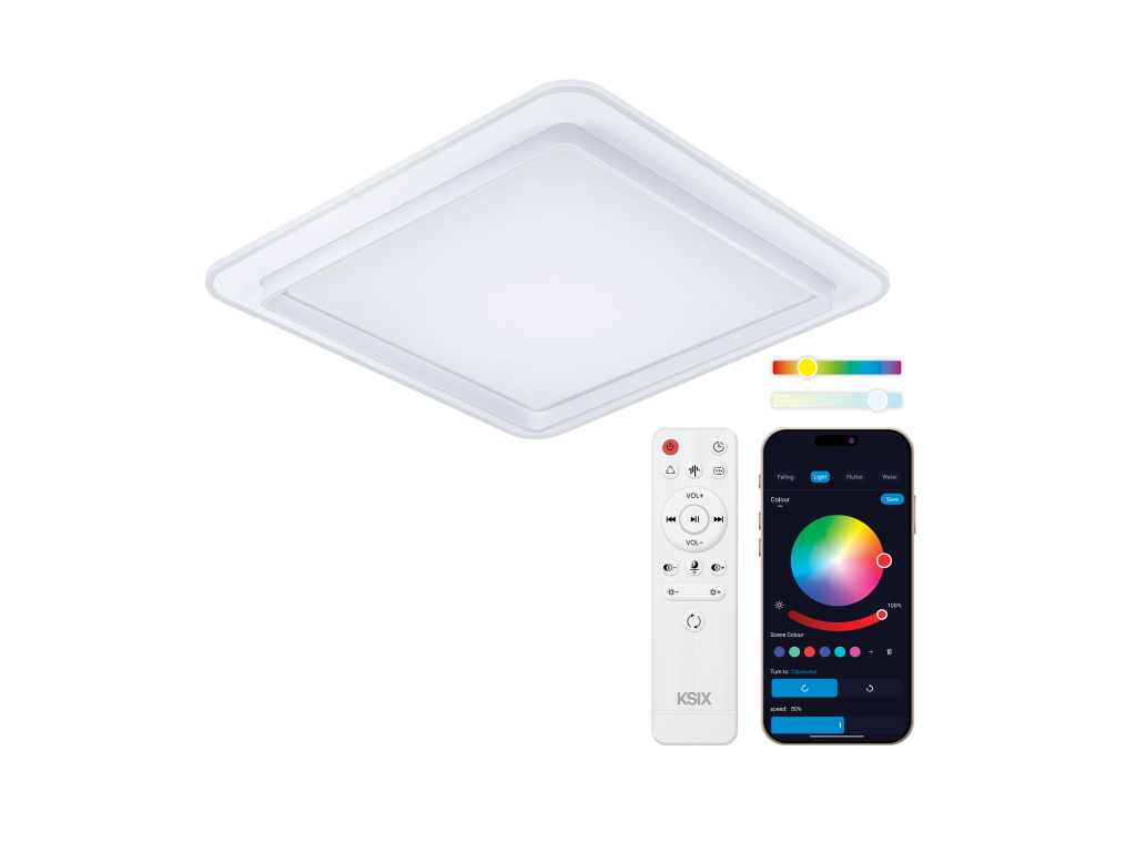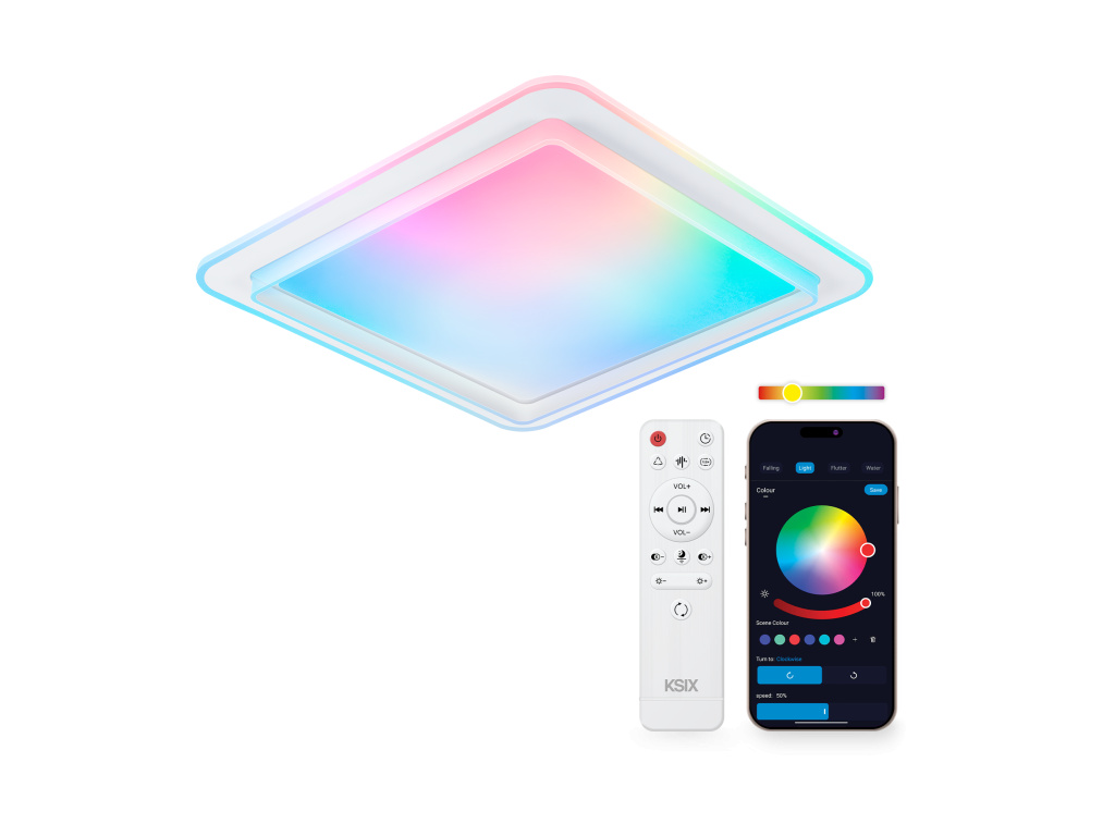 KSIX Celeste promění obyčejné stropní světlo v zážitek. Kombinuje silné bílé světlo s nastavitelnou teplotou, barevné RGBIC podsvícení a integrovaný Bluetooth reproduktor. To vše v elegantním čtvercovém provedení o rozměru 48,5 × 48,5 cm. Ovládání zvládnete pohodlně dálkovým ovladačem nebo přes aplikaci Tuya, která umožňuje nastavit scény, časovače i hlasové ovládání. Navíc poskytujeme záruku 3 roky - bez kompromisů.