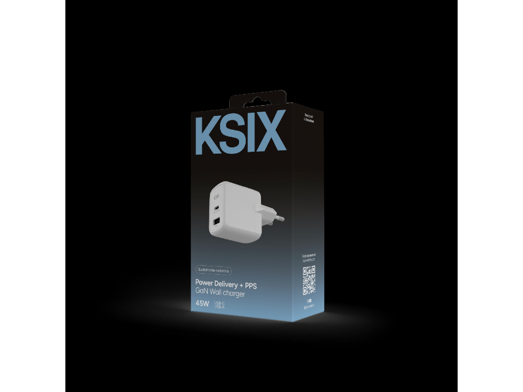 KSIX 45W GaN nabíječka spojuje kompaktní rozměry, moderní technologie a každodenní praktičnost. Díky technologii GaN nabízí rychlé a účinné nabíjení telefonů, sluchátek či menších zařízení, a to při minimálním zahřívání. Díky dvěma portům (USB-C a USB-A) a podpoře Power Delivery 3.0 a PPS je ideální volbou pro domácí použití, kancelář i cestování. Samozřejmostí je 3letá záruka, která podtrhuje spolehlivost a kvalitu této nabíječky.