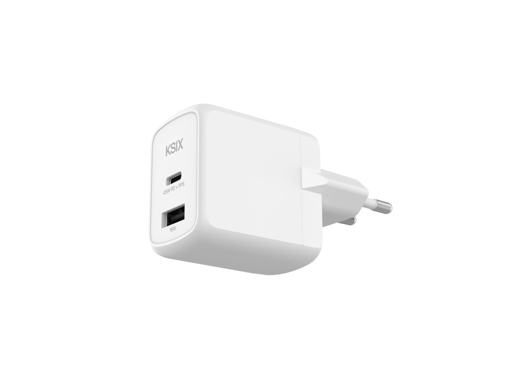 KSIX 45W GaN je moderní nabíječka, která spojuje kompaktní design s praktickým využitím. Díky jednomu portu USB-C a jednomu USB-A dokáže pohodlně nabíjet dvě zařízení současně – telefon, bezdrátová sluchátka nebo jinou elektroniku. Skvěle se hodí pro domácnost, kancelář i cestování.