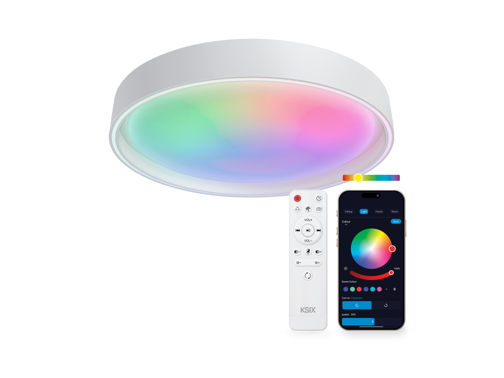 KSIX stropní svítidlo Helios přináší do každé místnosti harmonii světla, barev a zvuku. Kombinuje výkonné LED osvětlení s RGBIC efekty, nastavitelnou bílou a vestavěným Bluetooth reproduktorem. Ovládání je snadné přes aplikaci Tuya, dálkový ovladač nebo hlasem. Skvěle vypadá, perfektně svítí – a nabídne i hudbu, kdykoli chcete. Navíc se můžete spolehnout na záruku 3 roky.