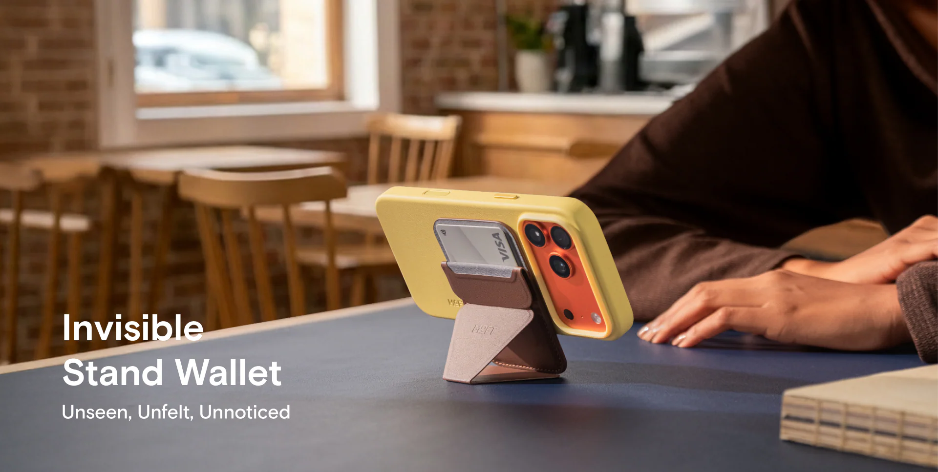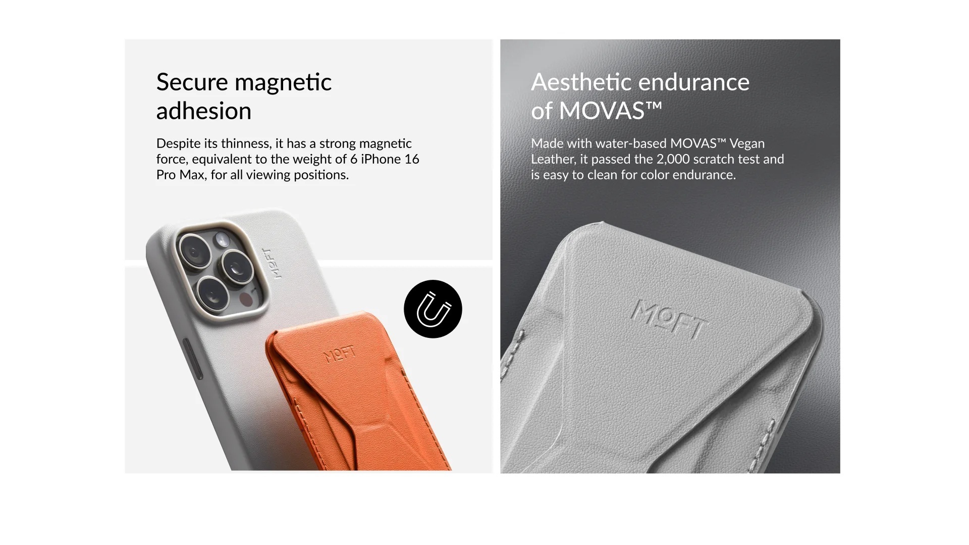 Tento minimalistický doplněk efektivně kombinuje funkci polohovatelného stojanu a tenké peněženky, která se díky MagSafe magneticky spojí s vaším iPhonem. Je vyroben z revoluční veganské kůže MOVAS™, která vyniká vysokou odolností, stálostí barev a příjemným povrchem na dotek. Chytrá skládací konstrukce umožňuje nastavit telefon do tří pozorovacích úhlů a zároveň bezpečně uschová až tři karty, aniž by narušila elegantní profil zařízení.