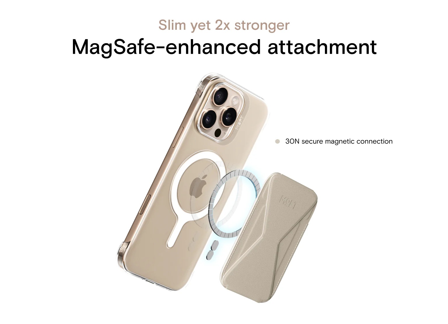 I přes svou minimalistickou tloušťku disponuje tato peněženka vylepšeným systémem uchycení se silou 30 Newtonů. To představuje 2x silnější magnetické spojení oproti standardnímu MagSafe příslušenství. Získáte tak jistotu, že peněženka zůstane pevně přicvaknutá k zádům telefonu bez ohledu na otřesy nebo manipulaci.