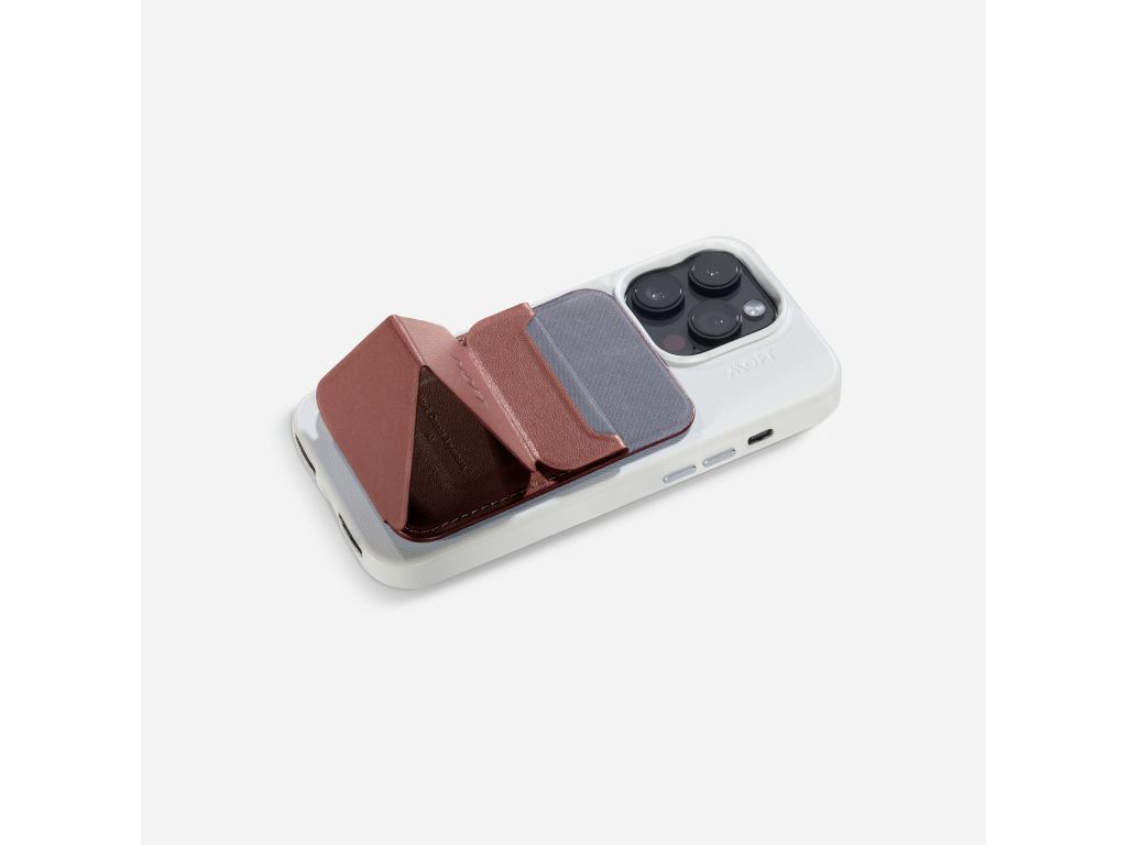 Tento minimalistický doplněk efektivně kombinuje funkci polohovatelného stojanu a tenké peněženky, která se díky MagSafe magneticky spojí s vaším iPhonem. Je vyroben z revoluční veganské kůže MOVAS™, která vyniká vysokou odolností, stálostí barev a příjemným povrchem na dotek. Chytrá skládací konstrukce umožňuje nastavit telefon do tří pozorovacích úhlů a zároveň bezpečně uschová až tři karty, aniž by narušila elegantní profil zařízení.