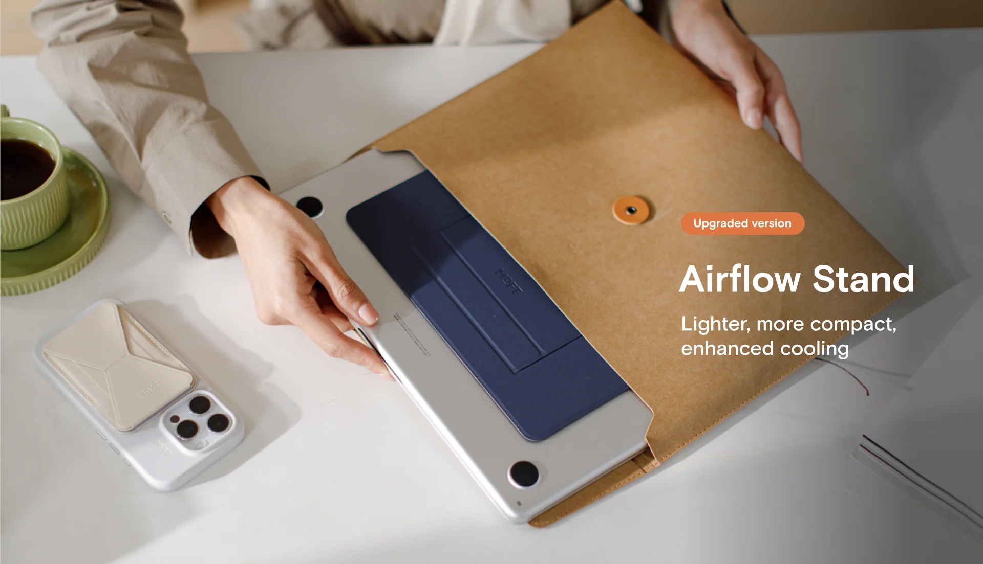 Airflow stojan váží pouhých 65 gramů – tolik co obálka s dokumenty. Na spodní straně notebooku o něm téměř nevíte, ale když potřebujete, poskytne pevnou oporu a správný náklon pro práci. Je to řešení, které máte stále u sebe, aniž by vás jakkoliv omezovalo.