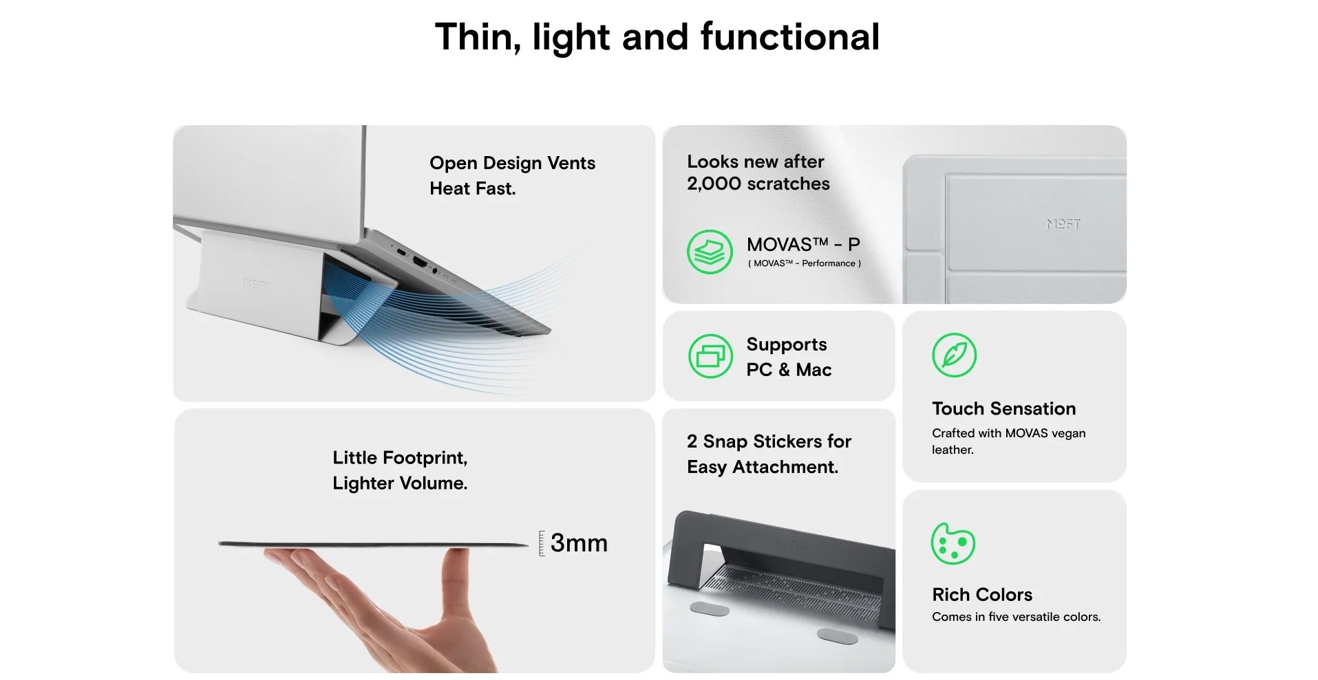 Airflow stojan funguje s PC i Mac notebooky. Díky dvěma přilnavým bodům jej snadno připevníte, přemístíte nebo znovu přilepíte. Dodává se v několika barevných variantách, aby ladil s vaším stylem i zařízením.