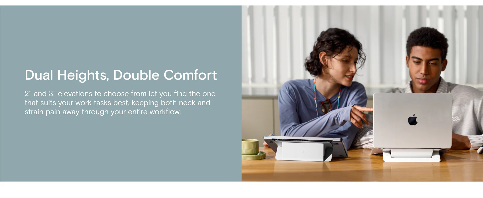 Díky dvěma výškovým polohám si snadno přizpůsobíte notebook podle aktivity – ať už sedíte u stolu sami, sdílíte obrazovku s kolegy nebo se jen chcete zbavit napětí v šíji. Správný úhel zlepšuje držení těla i soustředění.